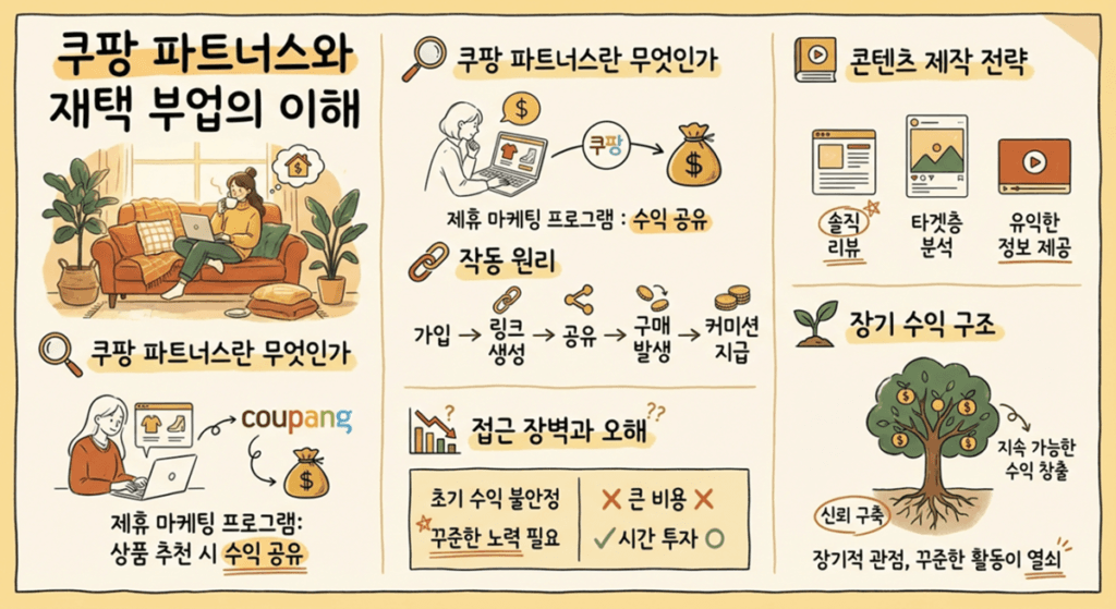 먼저 재택부업이라는 개념부터 먼저 짚고 가는 것이 좋습니다. 과거에는 단순 시간 단위 아르바이트나 수공업 이미지가 강했지만, 최근에는 블로그·콘텐츠·제휴 마케팅처럼 시간 대비 효율을 중시하는 방식으로 빠르게 이동하고 있습니다. 이런 활동은 시간과 장소에 구애를 받지 않는 특징이 있어 요즘은 많은 사람들이 사이드 잡으로 재택 부업을 선호합니다.재택 부업을 검색하다 보면 유난히 자주 보이는 키워드가 있습니다. 바로 쿠팡 파트너스입니다. 쿠팡 파트너스는 디지털 콘텐츠 제작의 흐름 위에 올라탄 대표적인 모델입니다.