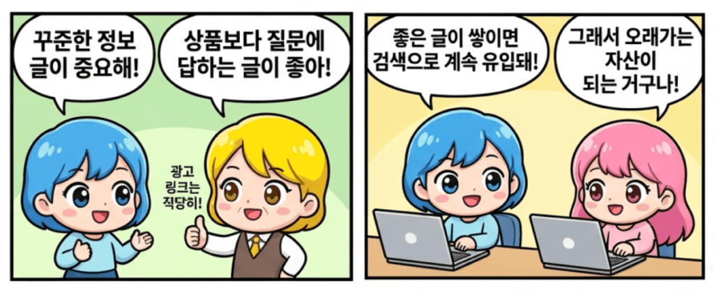 그렇다면 가장 쉽게 접근할 수 있는 블로그로 쿠팡 파트너스를 운영한다고 생각한다면 어떤 글을 써야 할까요? 여기에 대한 답은 생각보다 단순합니다.“상품을 팔기 위한 글”이 아니라, “사람들이 검색하는 질문에 답하는 정보성 글”로 출발해야 합니다. 따라서 제휴를 하고자 하는 제품에 대한 충분한 이해와 구매자들이 어떤 점을 궁금해 하는 지에 대한 근본적인 이해를 가지고 접근해야 합니다. 이런 글은 광고 링크가 거의 없어도 충분히 가치가 있고, 오히려 신뢰를 쌓는 데 유리합니다. 이렇게 작성된 블로그 글은 그 자체로 끝나지 않습니다. 요즘 콘텐츠 소비는 한 채널에서만 이루어지지 않기 때문입니다. 블로그는 검색에 강하고, 인스타그램의 릴스나 유튜브의 쇼츠는 노출과 확산에 강합니다. 따라서 개인이 능력에 따라 블로그와 더불어 짧은 영상 콘텐츠를  함께 투 트랙으로 병행하면 더욱 높은 시너지를 기대할 수 있습니다.